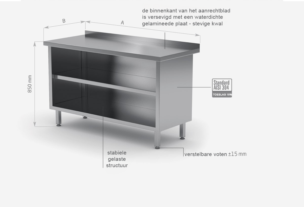 As standard, our products are made of AISI 430 stainless steel, and the elements exposed to the strongest chemical and organic agents are made of acid resistant steel AISI 304. All our furniture can also be made entirely of this material, surcharges to the AISI 304 standard have been given for each piece of furniture.
