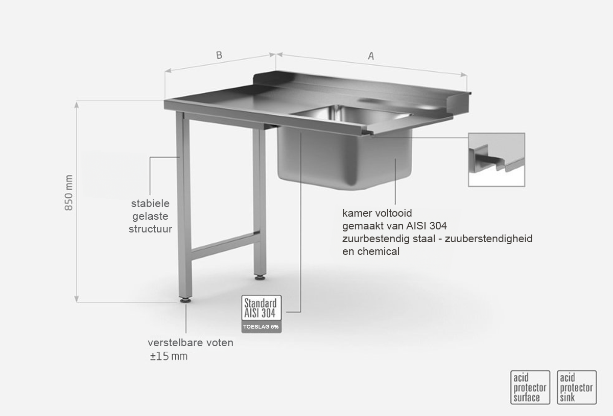 Onze producten zijn standaard gemaakt van roestvrij staal AISI 430, en elementen die worden blootgesteld aan de sterkste effecten van chemische en organische middelen zijn gemaakt van roestvrij staal, de zogenaamde Zuren AISI 304. Al onze meubelen kunnen ook volledig van dit materiaal gemaakt worden, toeslagen naar de norm AISI 304 worden telkens bij het meubel vermeld.