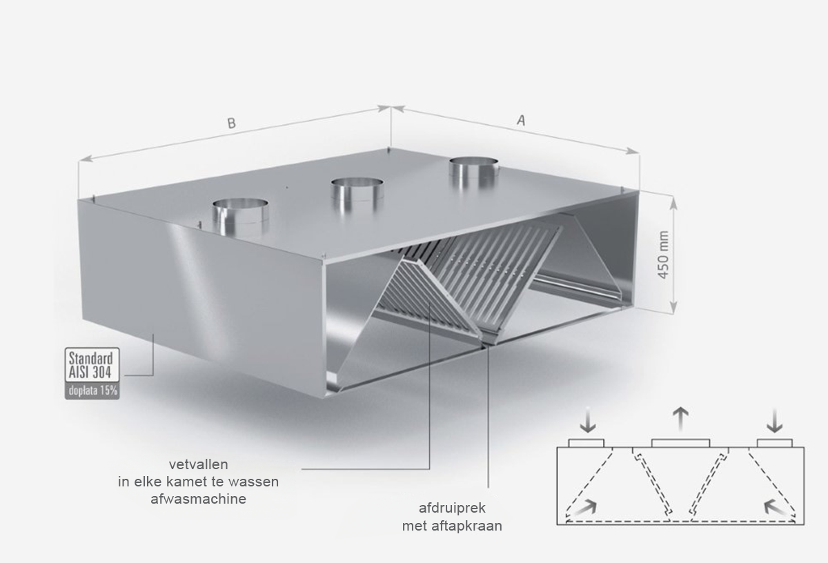 Inductie afzuigkappen zijn bedoeld voor gesloten ruimtes met centrale ventilatiesystemen. Ze vangen warmte, stoom en onzuiverheden (voornamelijk vetdeeltjes) op en verwijderen ze, terwijl ze zorgen voor een goed evenwicht tussen toevoer- en afvoerlucht. De afvoerlucht stroomt door de filters (vetvangers). Vetdeeltjes en onzuiverheden bezinken op de roosters en worden afgevoerd naar het druppelkanaal. Door de aftapkraan op de lekbak kunnen vet en onzuiverheden worden afgevoerd.