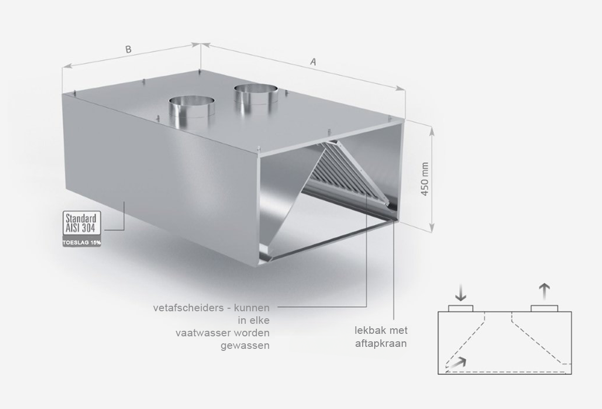 Inductie afzuigkappen zijn bedoeld voor gesloten ruimtes met centrale ventilatiesystemen. Ze vangen warmte, stoom en onzuiverheden (voornamelijk vetdeeltjes) op en verwijderen ze, terwijl ze zorgen voor een goed evenwicht tussen toevoer- en afvoerlucht. De afvoerlucht stroomt door de filters (vetvangers). Vetdeeltjes en onzuiverheden bezinken op de roosters en worden afgevoerd naar het druppelkanaal. Door de aftapkraan op de lekbak kunnen vet en onzuiverheden worden afgevoerd.