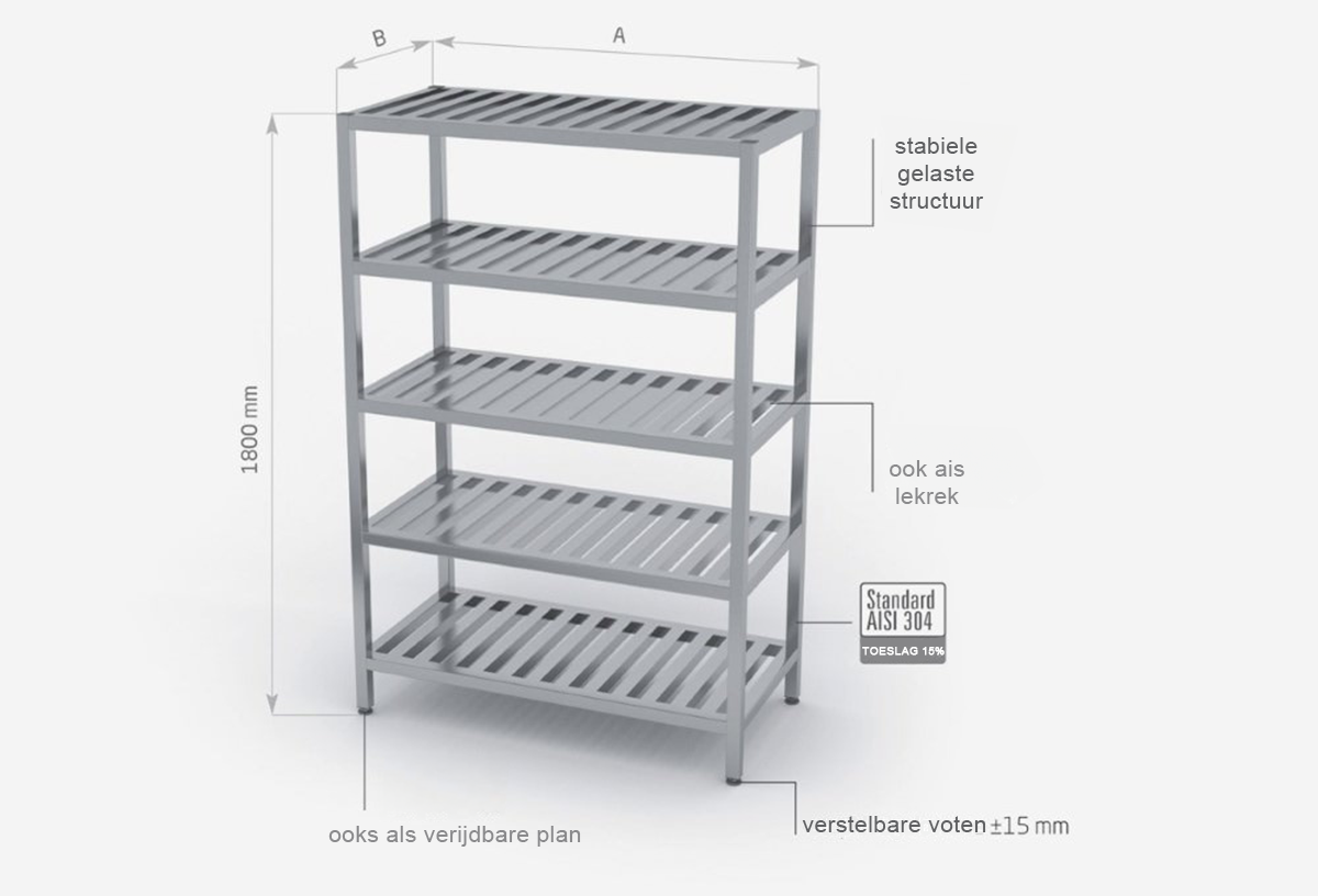 Onze producten zijn standaard gemaakt van roestvrij staal AISI 430, en elementen die worden blootgesteld aan de sterkste effecten van chemische en organische middelen zijn gemaakt van roestvrij staal, de zogenaamde Zuren AISI 304. Al onze meubelen kunnen ook volledig van dit materiaal gemaakt worden, toeslagen naar de norm AISI 304 worden telkens bij het meubel vermeld.
