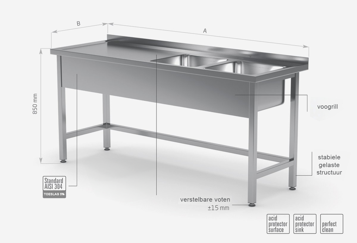 Onze producten zijn standaard gemaakt van roestvrij staal AISI 430, en elementen die worden blootgesteld aan de sterkste effecten van chemische en organische middelen zijn gemaakt van roestvrij staal, de zogenaamde Zuren AISI 304. Al onze meubelen kunnen ook volledig van dit materiaal gemaakt worden, toeslagen naar de norm AISI 304 worden telkens bij het meubel vermeld.
