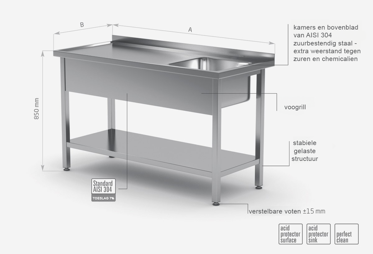 Onze producten zijn standaard gemaakt van roestvrij staal AISI 430, en elementen die worden blootgesteld aan de sterkste effecten van chemische en organische middelen zijn gemaakt van roestvrij staal, de zogenaamde Zuren AISI 304. Al onze meubelen kunnen ook volledig van dit materiaal gemaakt worden, toeslagen naar de norm AISI 304 worden telkens bij het meubel vermeld.