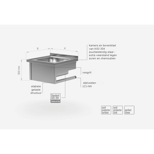 Onze producten zijn standaard gemaakt van roestvrij staal AISI 430, en elementen die worden blootgesteld aan de sterkste effecten van chemische en organische middelen zijn gemaakt van roestvrij staal, de zogenaamde Zuren AISI 304. Al onze meubelen kunnen ook volledig van dit materiaal gemaakt worden, toeslagen naar de norm AISI 304 worden telkens bij het meubel vermeld.