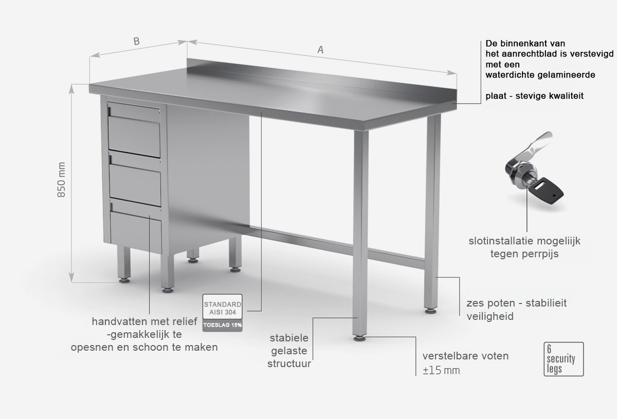Onze producten zijn standaard gemaakt van roestvrij staal AISI 430, en elementen die worden blootgesteld aan de sterkste effecten van chemische en organische middelen zijn gemaakt van roestvrij staal, de zogenaamde Zuren AISI 304. Al onze meubelen kunnen ook volledig van dit materiaal gemaakt worden, toeslagen naar de norm AISI 304 worden telkens bij het meubel vermeld.